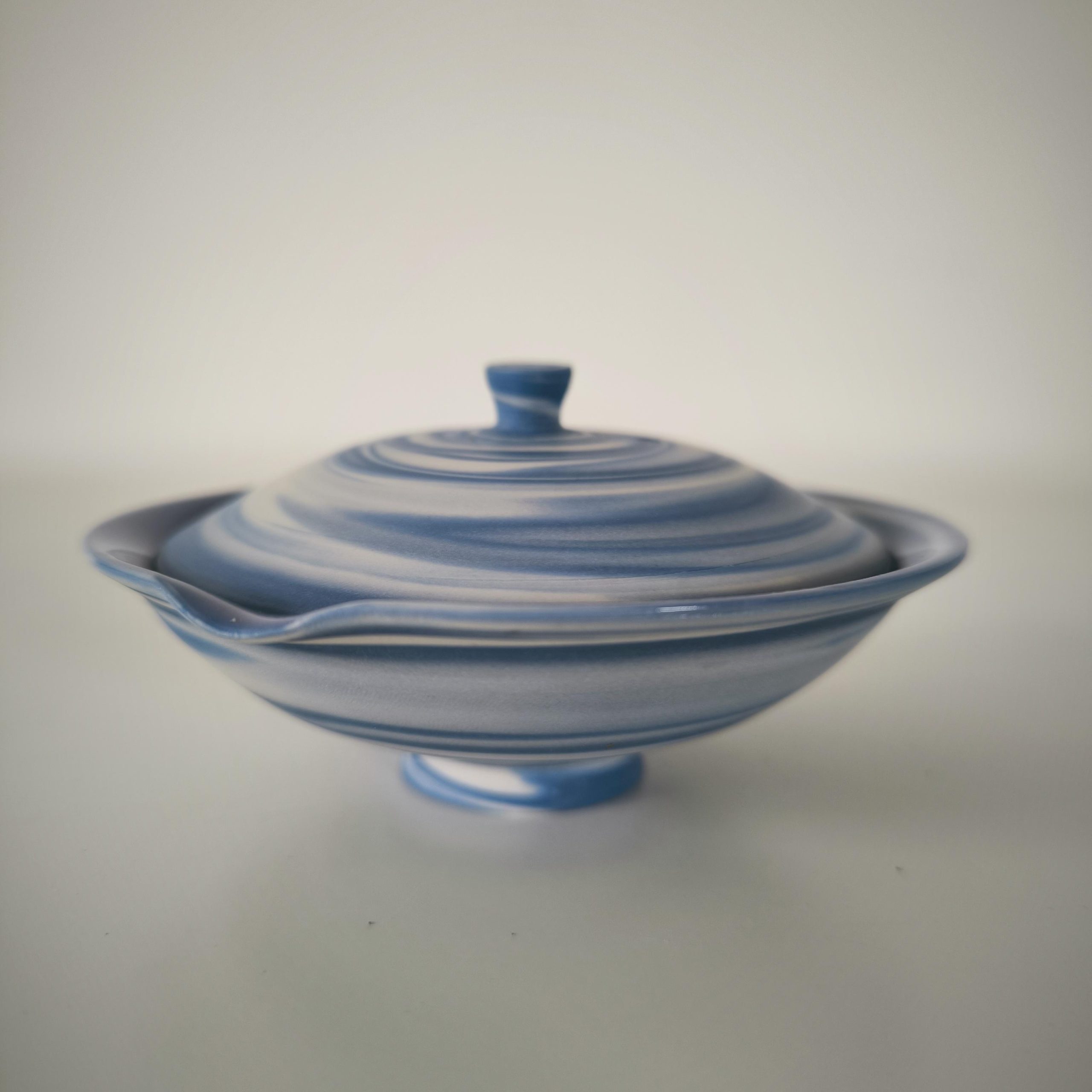 Détails différenciants | Petite fissure au couvercle (limée et protégée par émail, sans impact sur l’utilisation), motifs nerikomi traversant toute l’épaisseur de l’argile |